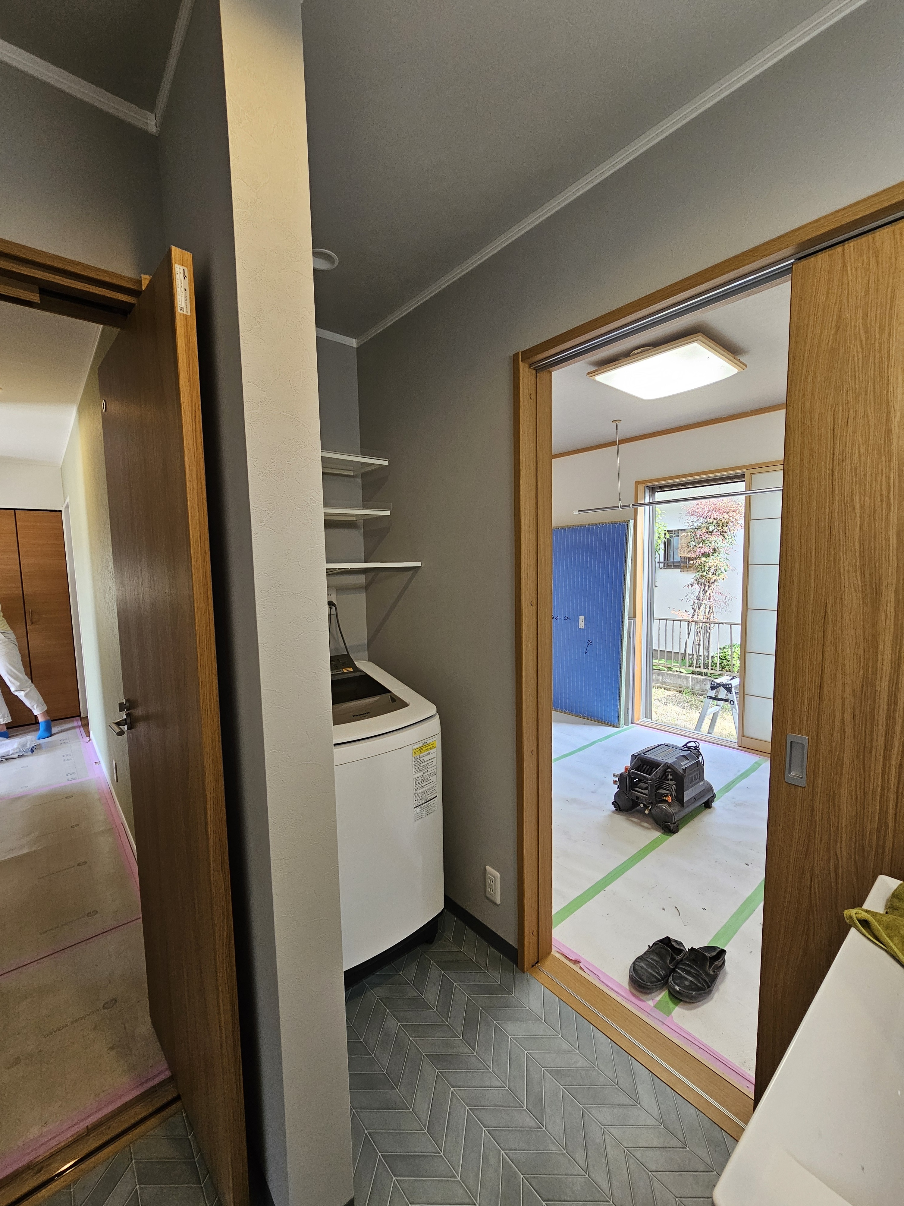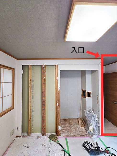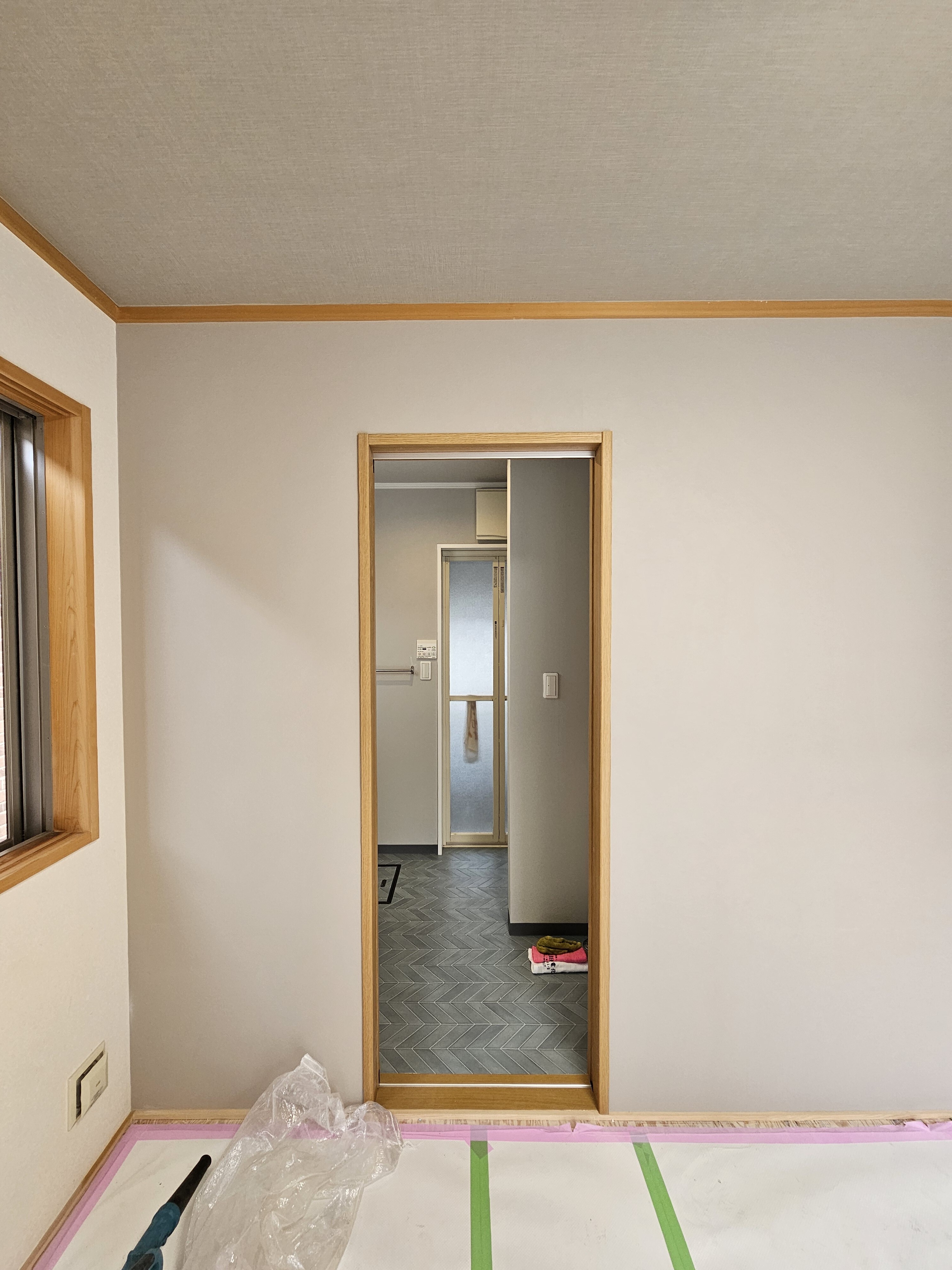 壁を塞ぎ、新たに洗面所側へ続くドアを設置。